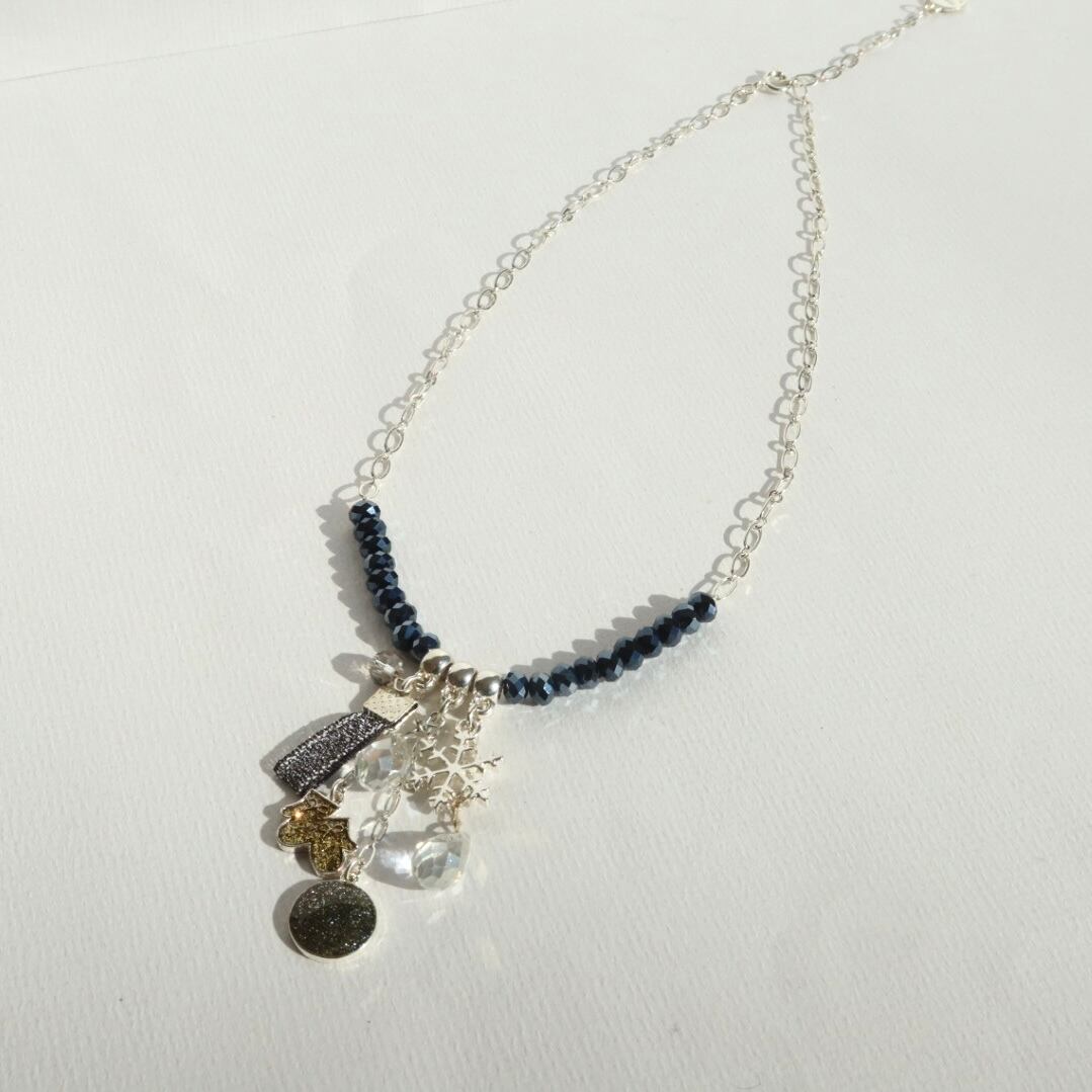 このウィンター ネックレスは、冬の雰囲気を感じさせてくれるアイテムです。グローブや雪の結晶などのウィンターチャームがついており、シルバーとネイビーの組み合わせも可愛い。寒い季節のコーディネートにぴったりで、日常使いや特別な日のアクセサリーとしてもお勧めです。